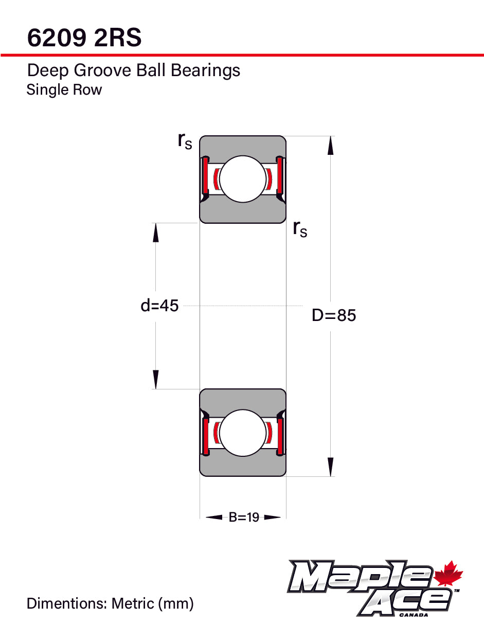 • 6209 2RS C3 Deep Groove Ball Bearing dimensions: Bore Diameter 45mm, Outside Diameter 85mm, Width 19mm. It is made of 100% Chrome Steel and Pre-Lubricated with High-Quality Grease, ideal for use in High—and Low-temperature settings.